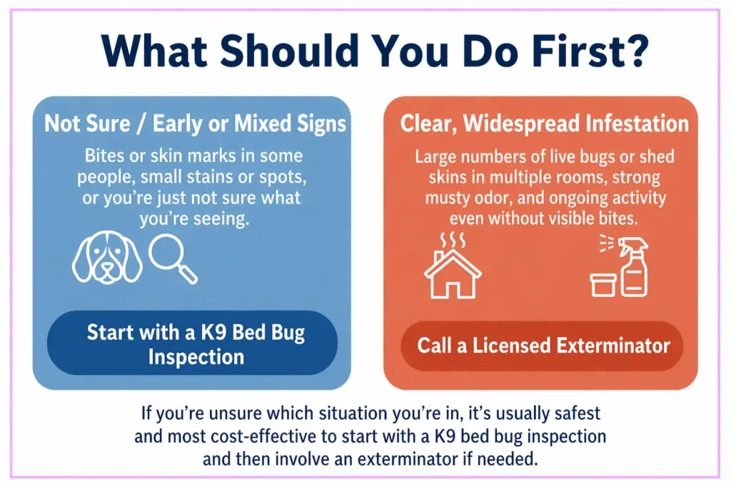 When you’re deciding between a bed bug inspection vs exterminator, it usually makes sense to start with inspection before treatment, especially if bites or marks are new and you’re not yet sure what’s going on.
